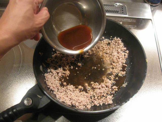 写 真 5 |  | ひき肉に火が通ったら、さっきの合わせ調味料を加えます。 ちょっと合わせ調味料の量が足りなかったかな? |